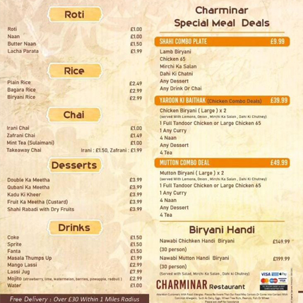 Charminar Restaurant takes pride in offering a diverse menu that changes daily, showcasing the rich culinary heritage of Hyderabad. Whether you're a fan of aromatic spices or succulent meats, this restaurant has something to satisfy every palate. The signature dishes, such as Lamb and Chicken Hyderabadi Biryani, Irani Chai, and Zafrani Chai, are available every day, ensuring a consistent taste of Hyderabad.